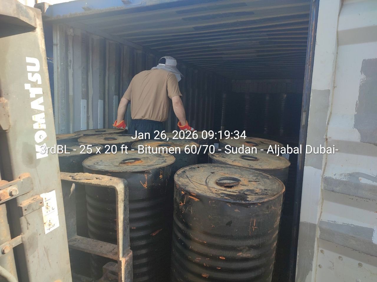 The third part of the January 2026 shipment was dispatched on January 22, 2026, from Jebel Ali Port in the UAE, consisting of 25 containers (20 ft each). Each container carried an average of 550 steel drums, each containing net 180 kg of bitumen 60/70.