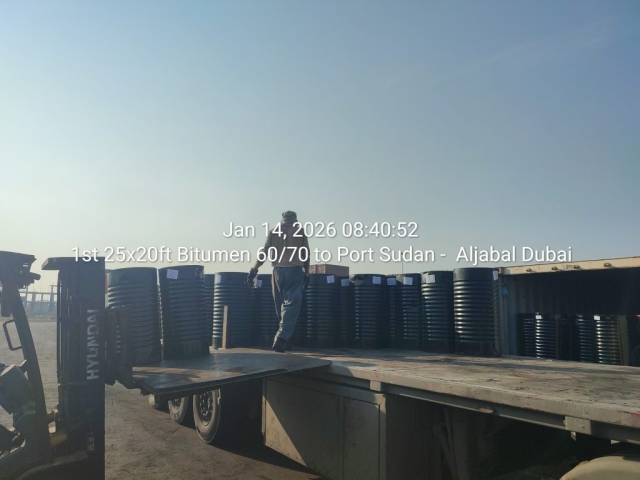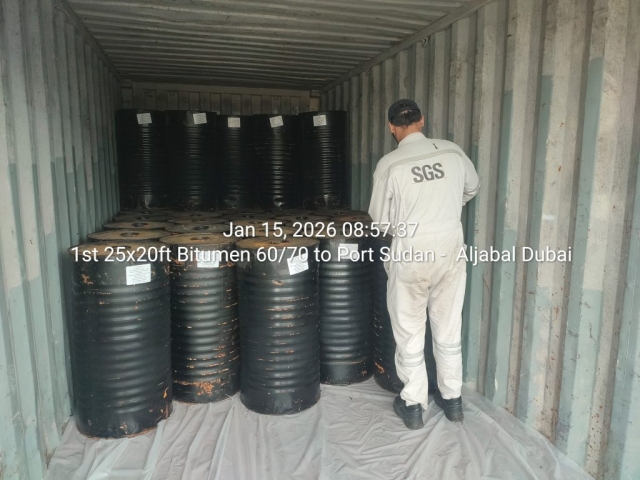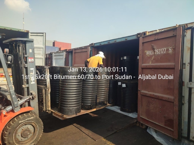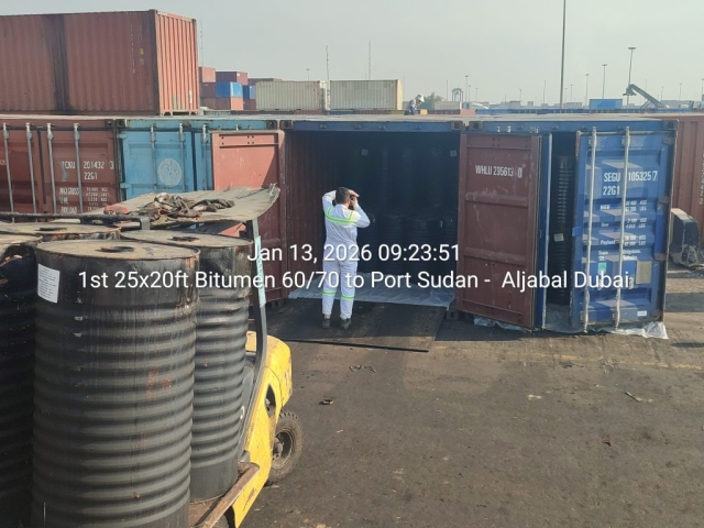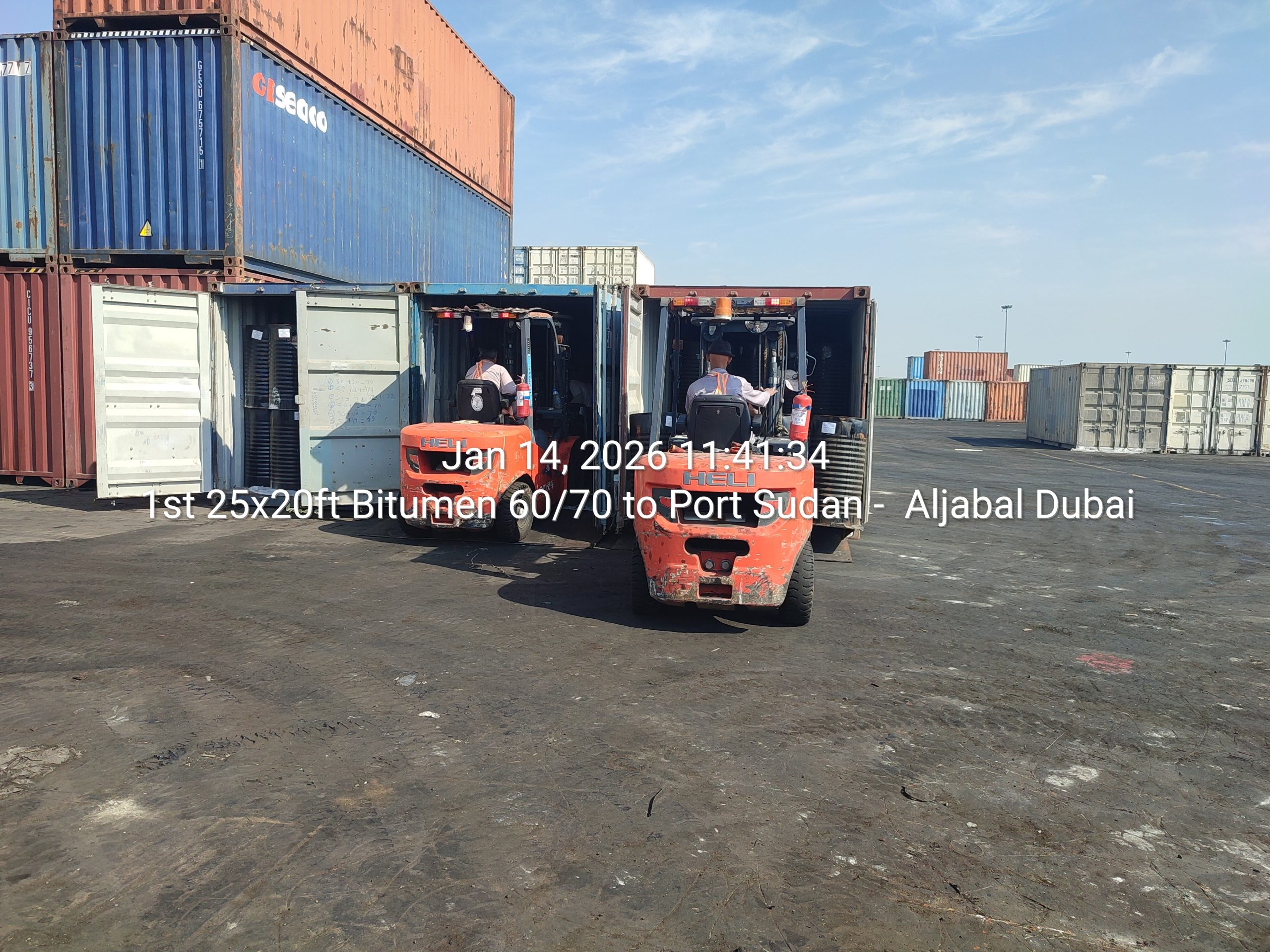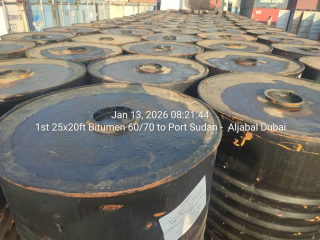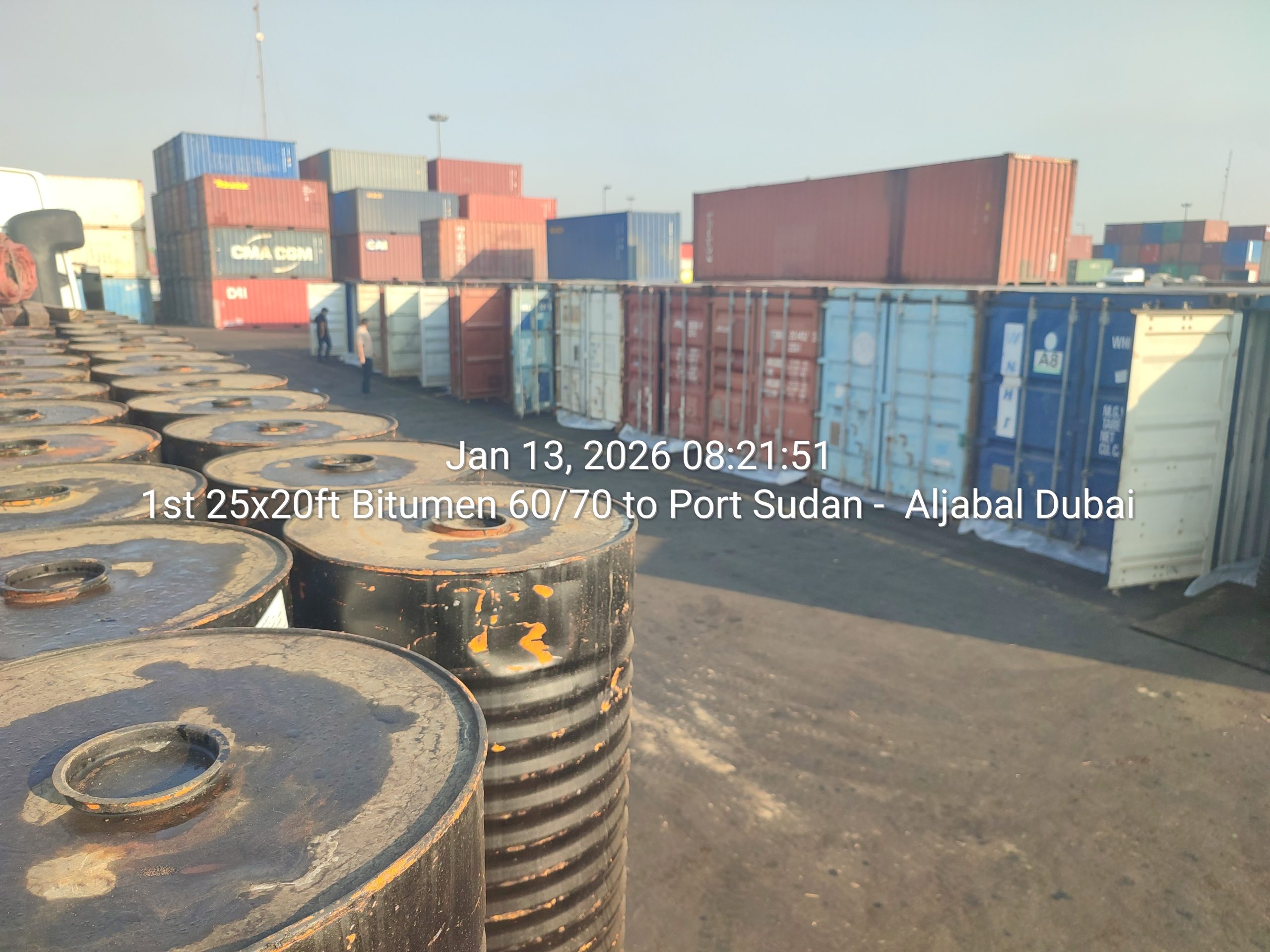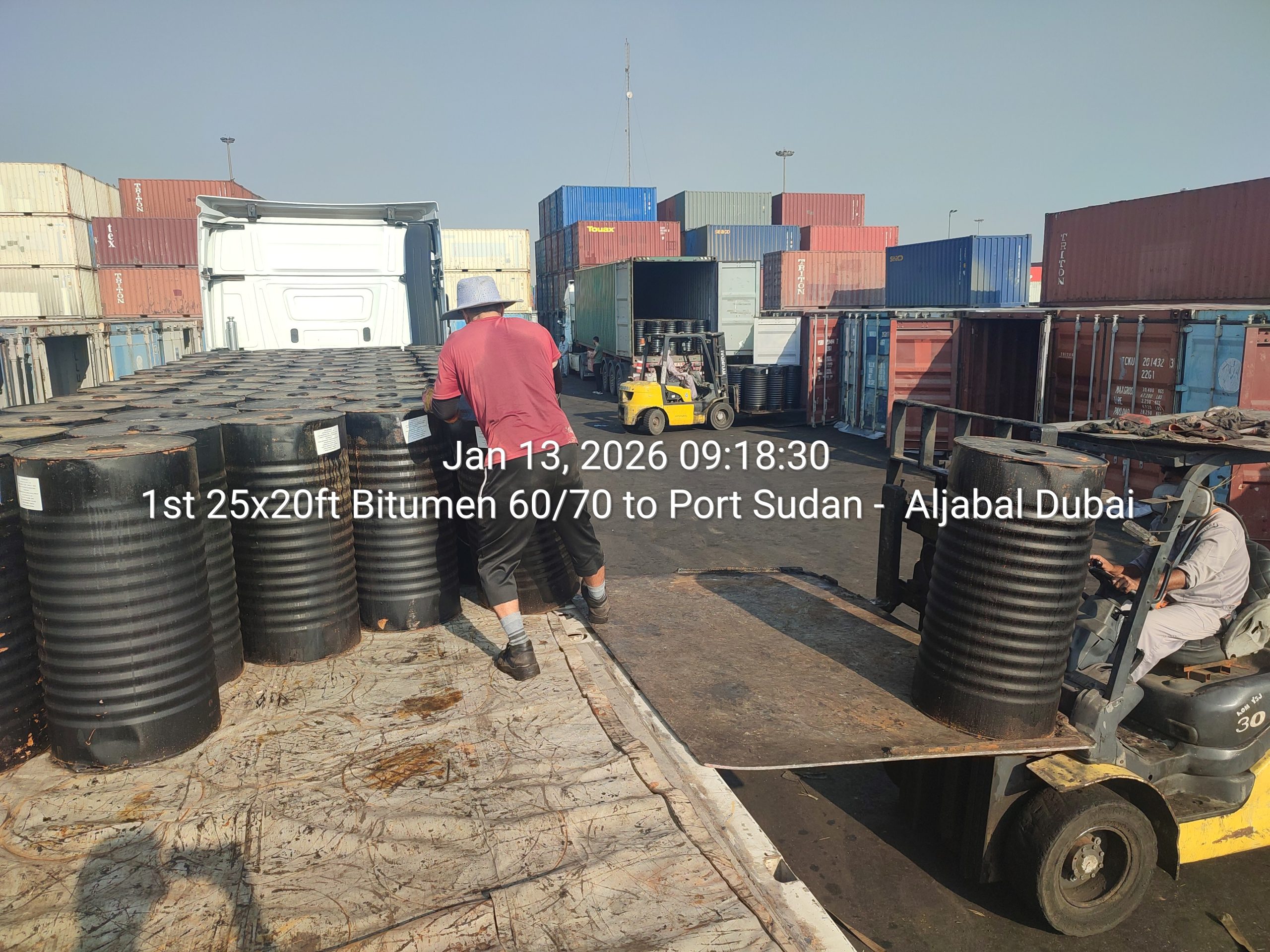 The bitumen was shipped in 20-foot containers, each loaded with 110–120 steel drums. It traveled by ocean freight from UAE’s jebel ali port to Port Sudan, taking approximately 12–18 days.